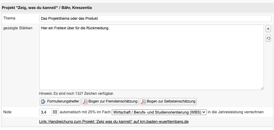 Falls ein zugehöriges Fach ausgewählt wurde, wird die Projektnote automatisch zu 25% in die Jahresleistung verrechnet.