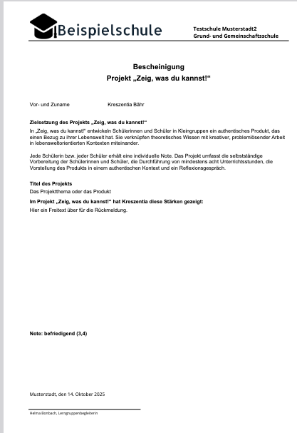 Der Text unter „gezeigte Stärken“ wird in die Bescheinigung übernommen, die automatisch mit dem Jahreszeugnis als Anhang gedruckt wird.