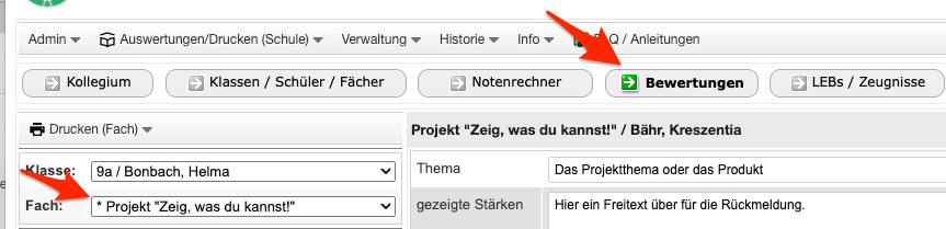 „Bewertungen“ als Fach: „* Projekt Zeig was du kannst!“ in der Liste als letzten Eintrag.