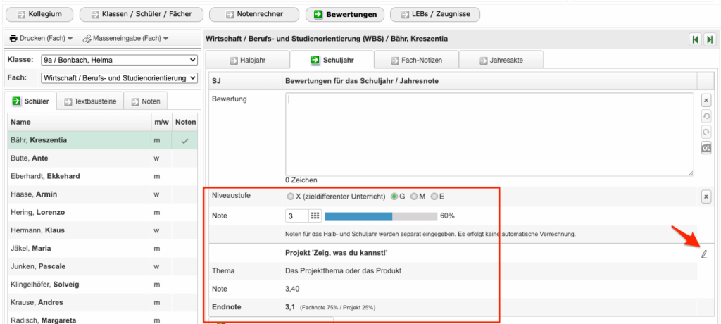 Zusätzlich kann die Klassenlehrkraft über die Seite „LEBs/Zeugnisse“ / Tab „Schuljahr“ mit einem Button neben der Note für die Projektarbeit auf die Eingabemaske zugreifen.