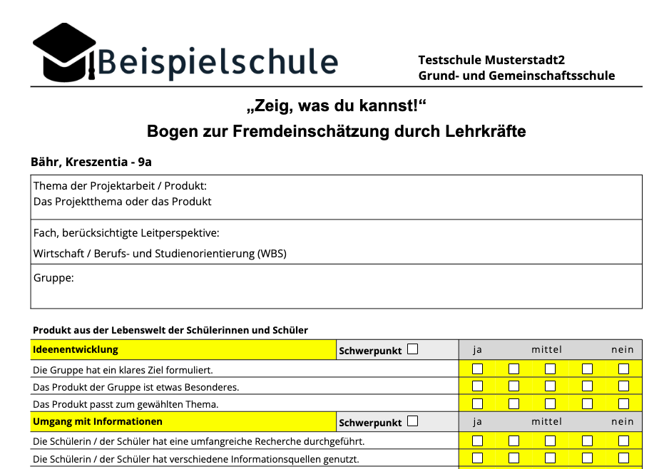 Über die Buttons „Bogen zur Fremdeinschätzung“ und „Bogen zur Selbsteinschätzung“ können die entsprechenden Formblätter ausgedruckt werden.