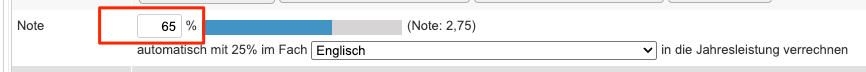 Wenn Sie in den Programmeinstellungen die Noteneingabe vollständig auf Prozentwerte umgestellt haben, erfolgt auch die Eingabe und der Druck der Projektnote als Prozentwert.