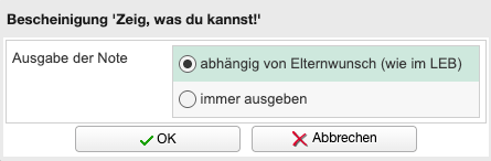 Die Ausgabe der Note bzw. des Prozentwertes erfolgt grundsätzlich nur dann, wenn in den Schülerdaten der entsprechende Notenwunsch der Eltern hinterlegt ist.