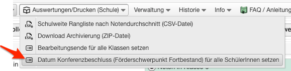 Um das Datum der Klassenkonferenz zentral für alle SchülerInnen zu setzen oder zu löschen, nutzen Sie bitte den entsprechenden Menüpunkt. Hierfür ist eine Schulleitungs-Team-Berechtigung erforderlich.
