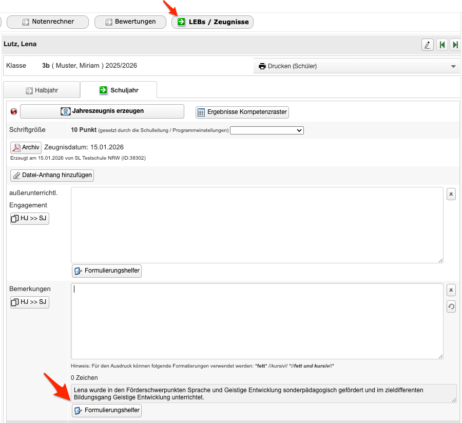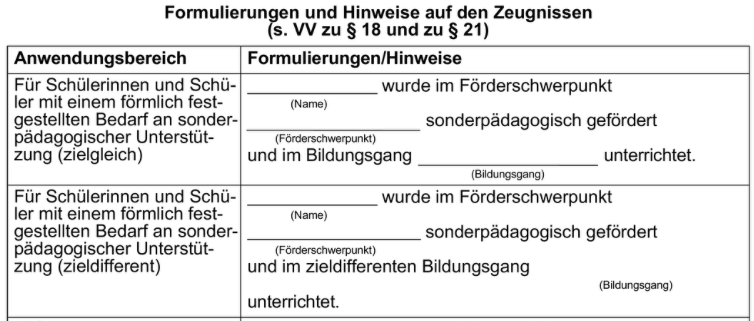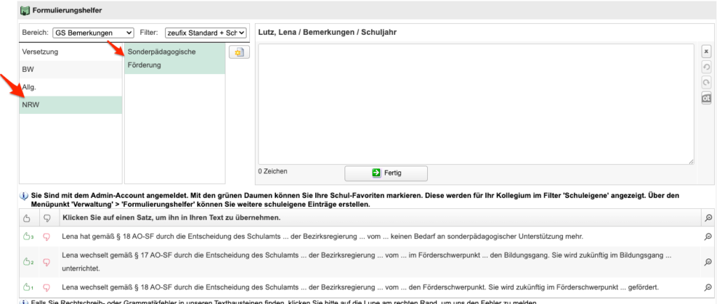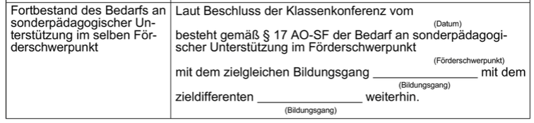 Weitere Textvorlagen, zum Beispiel zur Aufhebung des Förderbedarfs oder zum Wechsel des Förderschwerpunkts, finden Sie im Formulierungshelfer des Bemerkungsfeldes.