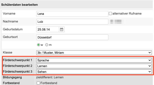 Beim Import werden die Förderschwerpunkte 1 und 2 automatisch aus Ihren SchILD-Daten übernommen.